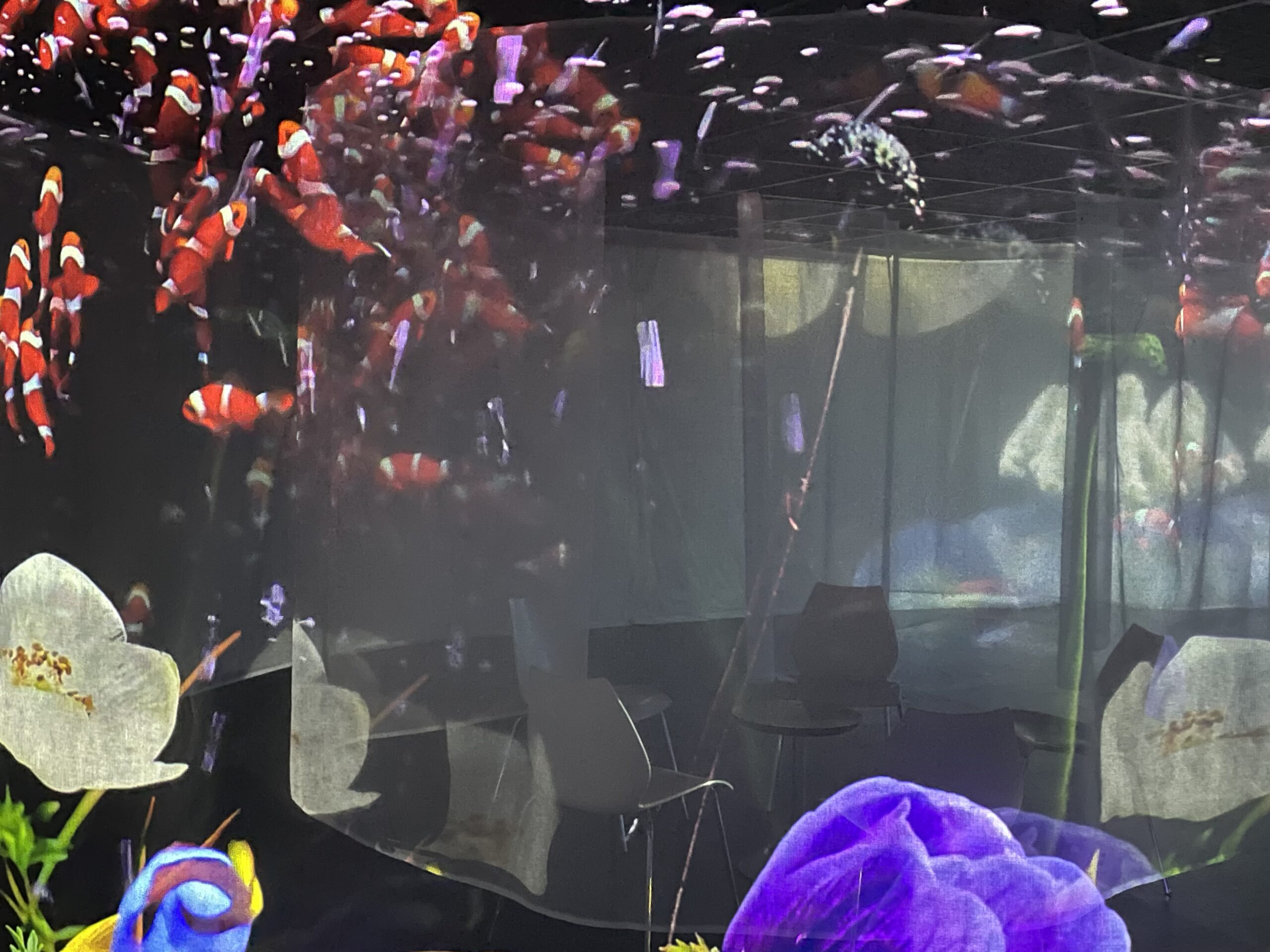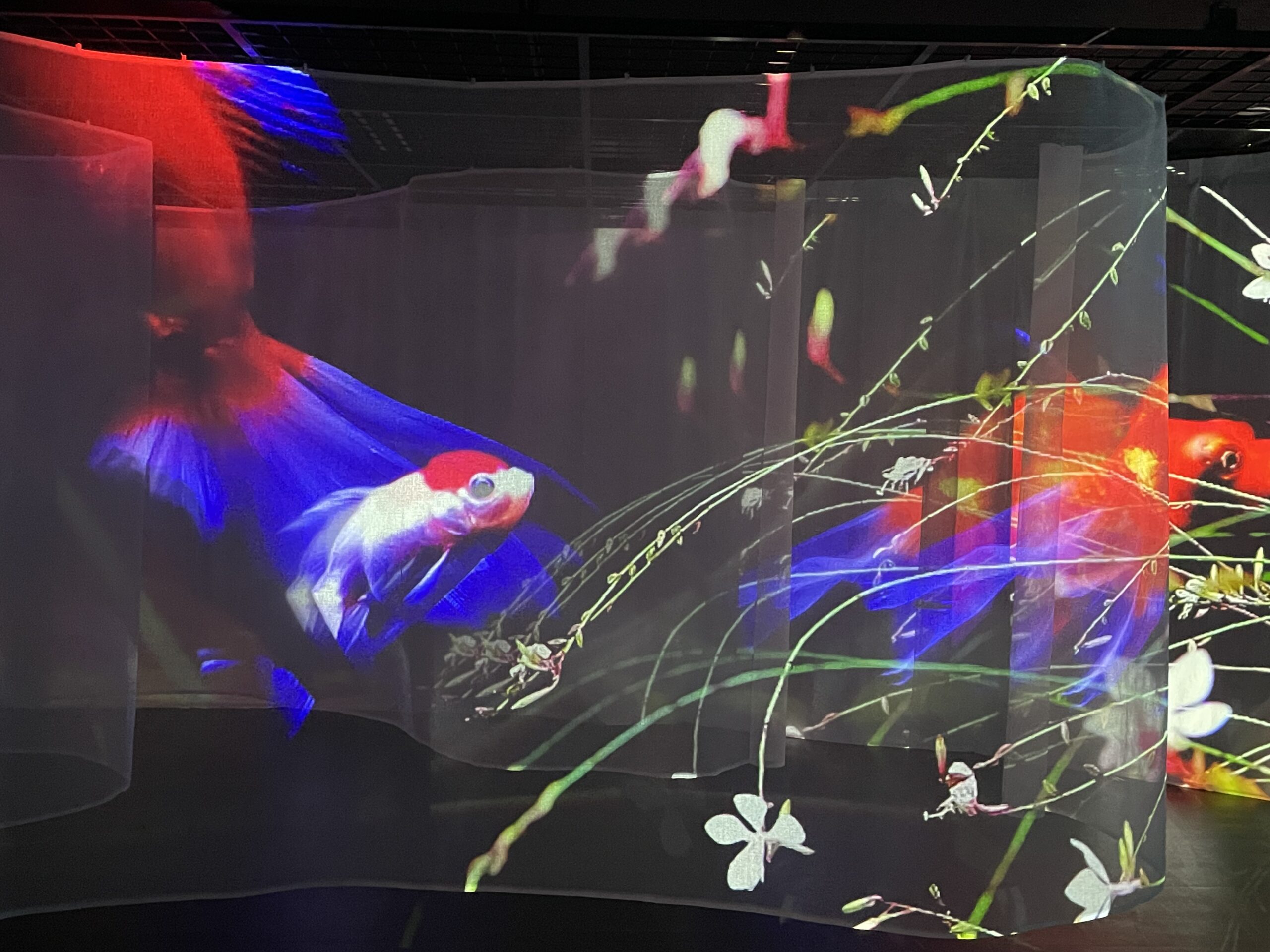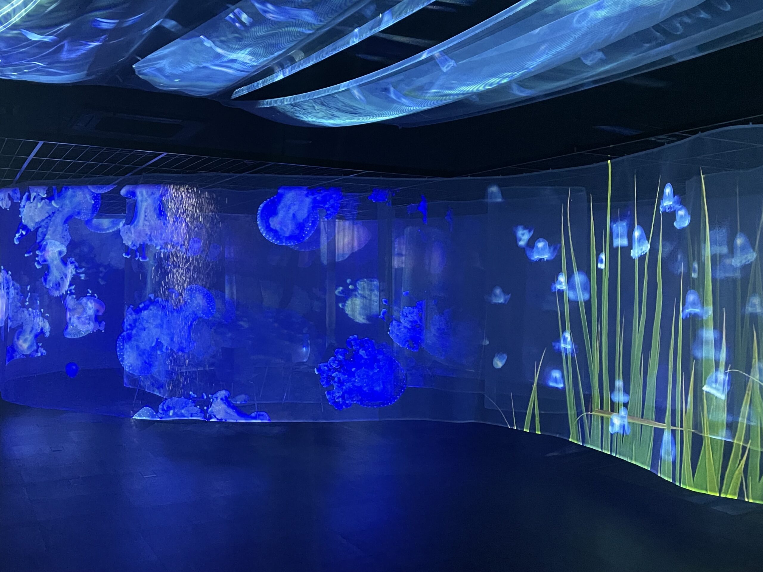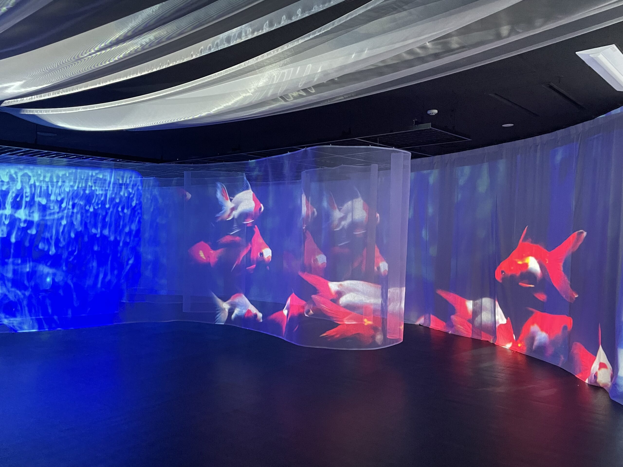 写真ではどうしてもこのすごさが伝わりにくいのですが、実際はとても美しく、滑らかに動き続けています。こうした投影があるだけで空間の印象がガラッと変わり、その場所自体の価値が一段と高まったように感じました。